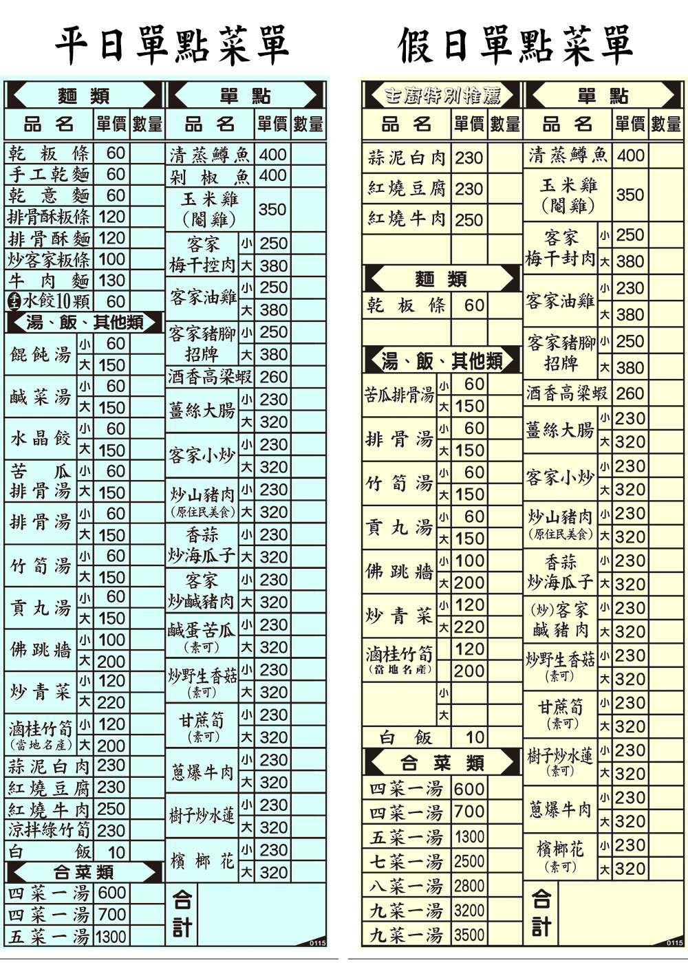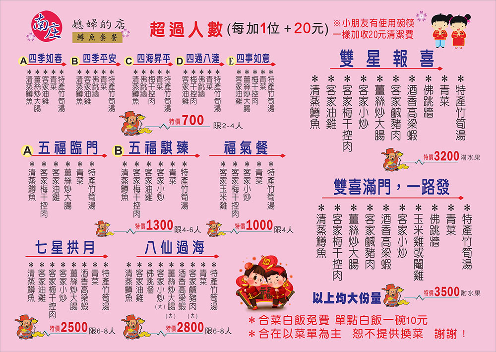 南庄媳婦的老店招牌的薑絲炒大腸和客家小炒一向是老主顧們的最愛,由於南庄水源潔淨是鱒魚的重要產地,許多小家庭也很喜歡我們所準備的鱒魚套餐,既經濟又實惠。 2010年更以在地食材、精湛的手藝分別奪得第1屆客家筵席料理比賽非職業組冠。